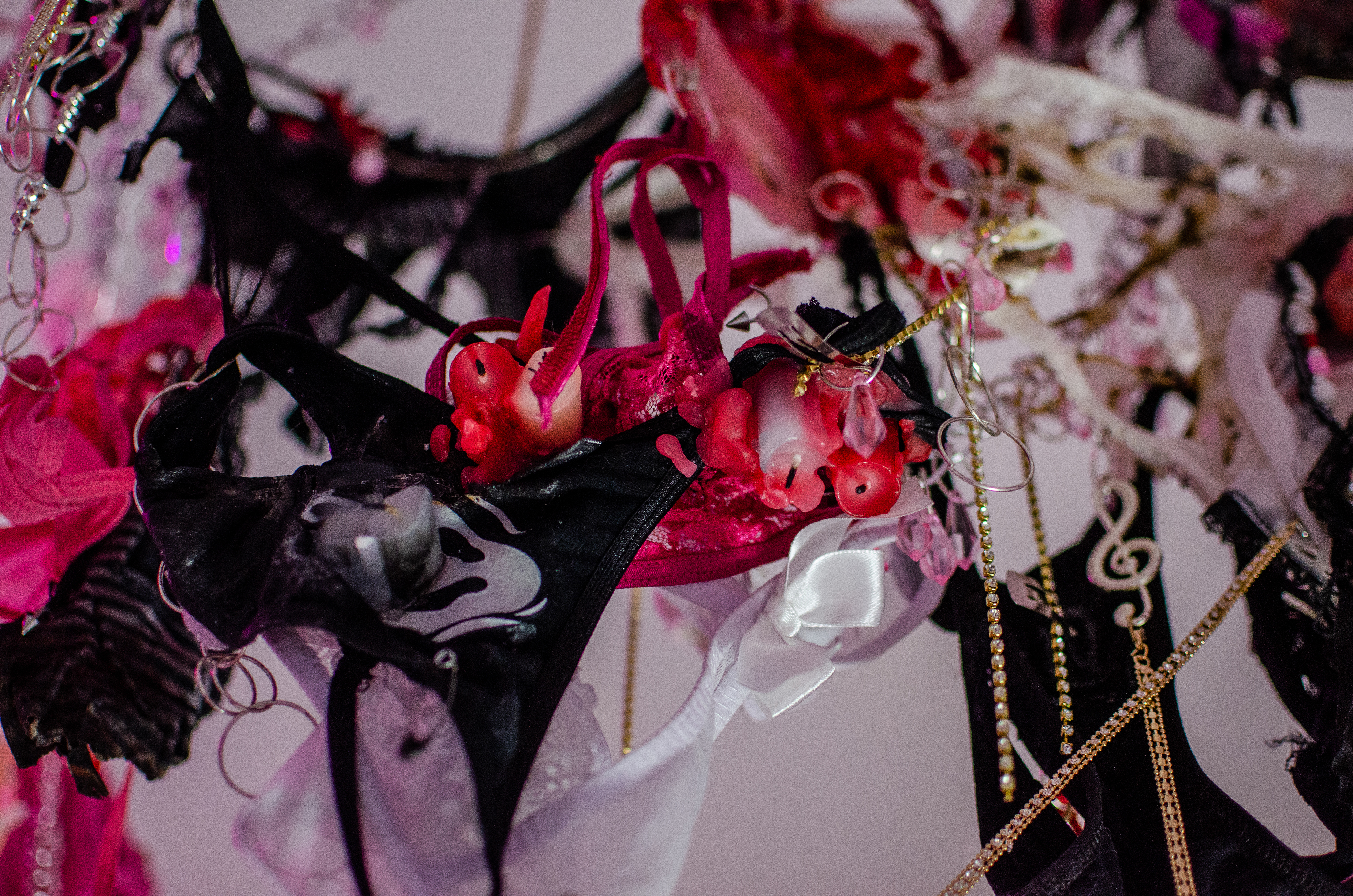 ❤ Perrita #1. 2021, Peluche, cadenas, ropa interior, velas, listón y bisutería. Medidas variables ❤